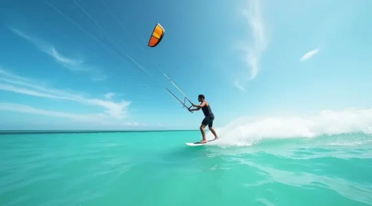 Le kitesurf consiste à glisser sur une planche en étant tracté par une aile (un cerf-volant de puissance). La principale différence avec le wakeboard est que la traction est plus verticale et que la gestion de l’aile ajoute une troisième dimension à la pratique. Ce sport, qui nécessite des conditions de vent établies, offre des sensations de légèreté et de puissance incomparables, avec la possibilité de réaliser des sauts impressionnants.