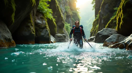 Les sports d’eau vive (rafting, canyoning, nage en eau vive) consistent à descendre des cours d’eau. Il s’agit moins de lutter contre les courants que d’apprendre à les utiliser pour se guider. La randonnée aquatique est une forme de canyoning plus accessible, sans les passages verticaux qui nécessitent des cordes. Ces activités offrent des points de vue uniques sur des paysages souvent inaccessibles autrement.